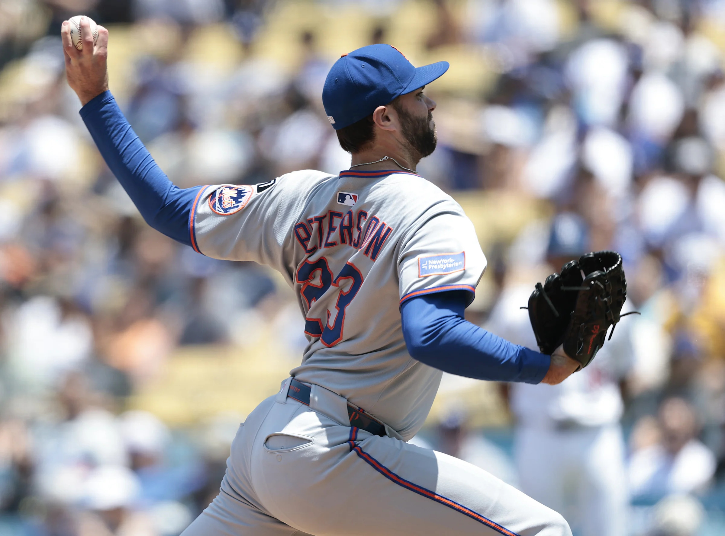 LOS ANGELES, CALIFORNIA – JUNE 05: David Peterson #23 of the New York Mets throws against the Los Angeles Dodgers…
