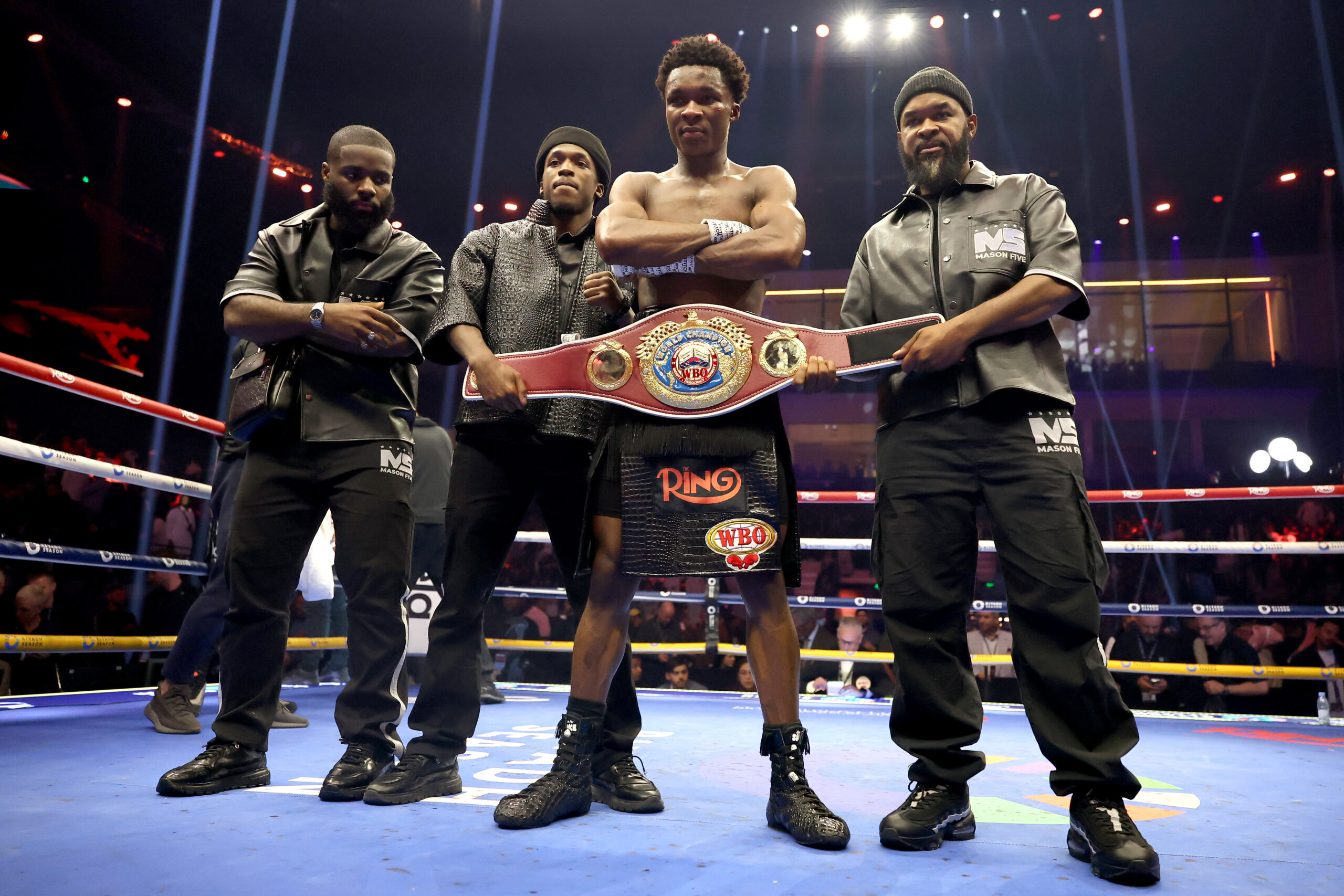 RIYADH, SAUDI ARABIA – NOVEMBER 22: Abdullah Mason (C) poses with his team after defeating Sam Noakes by unanimous decision…