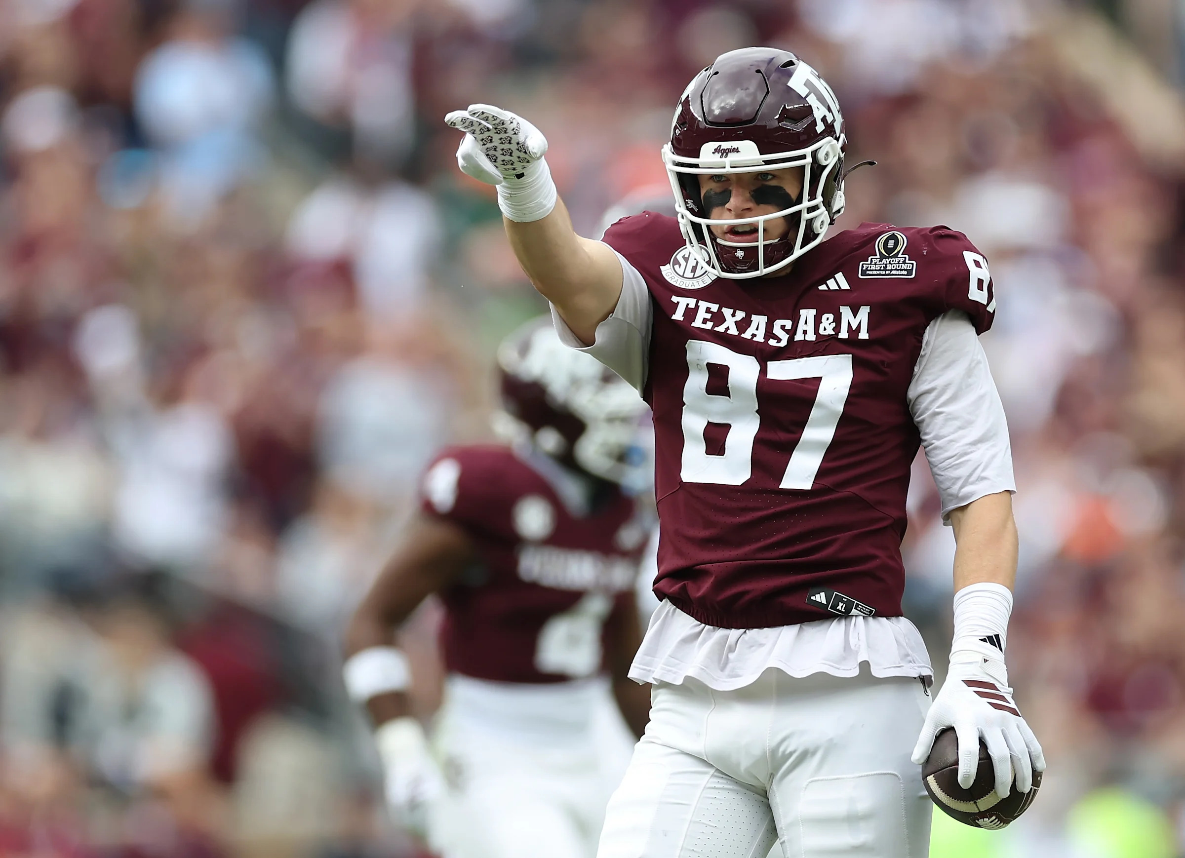 COLLEGE STATION, TEXAS – DECEMBER 20: Nate Boerkircher #87 of the Texas A&M Aggies reacts after a first down in…